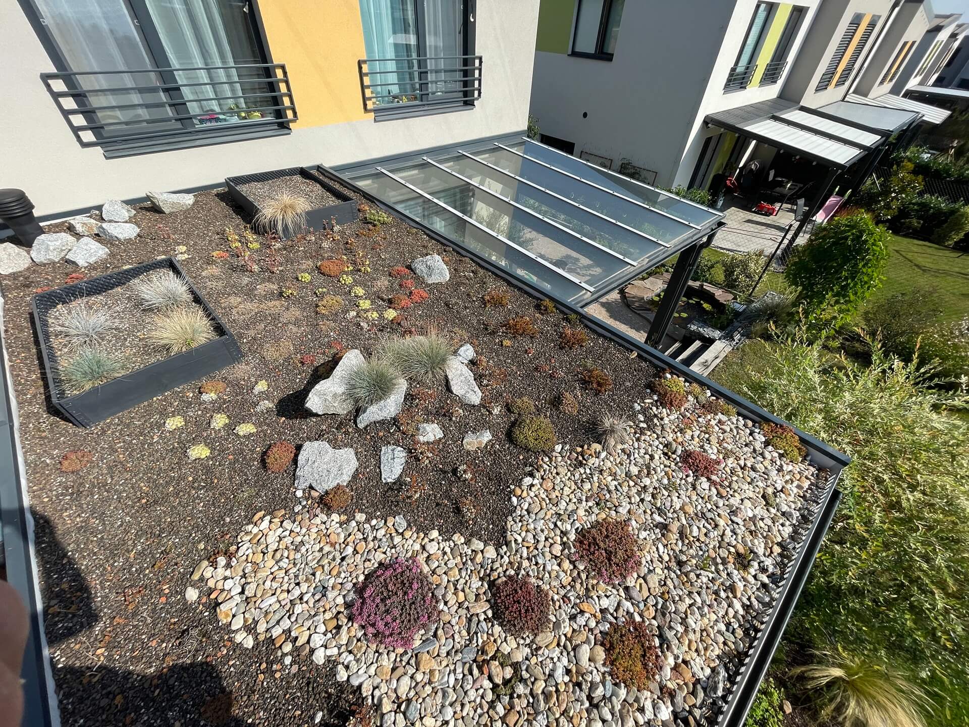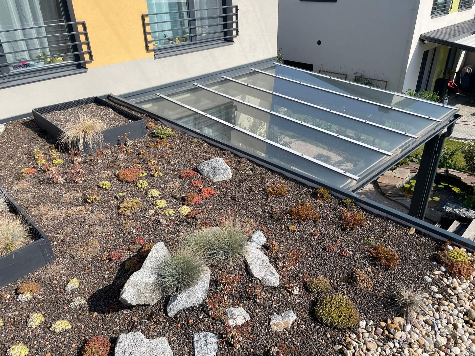 - Vychytaná skladba: Hydroizolační vrstva, ochranná textilie, retenční vrstva a finální vrstva z rozchodníkových kazet nebo koberců.